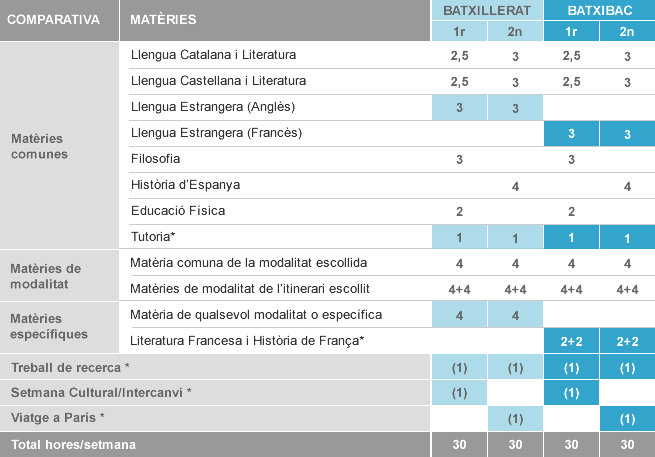 * Aquestes matèries/activitats en el Batxibac es fan en francès.